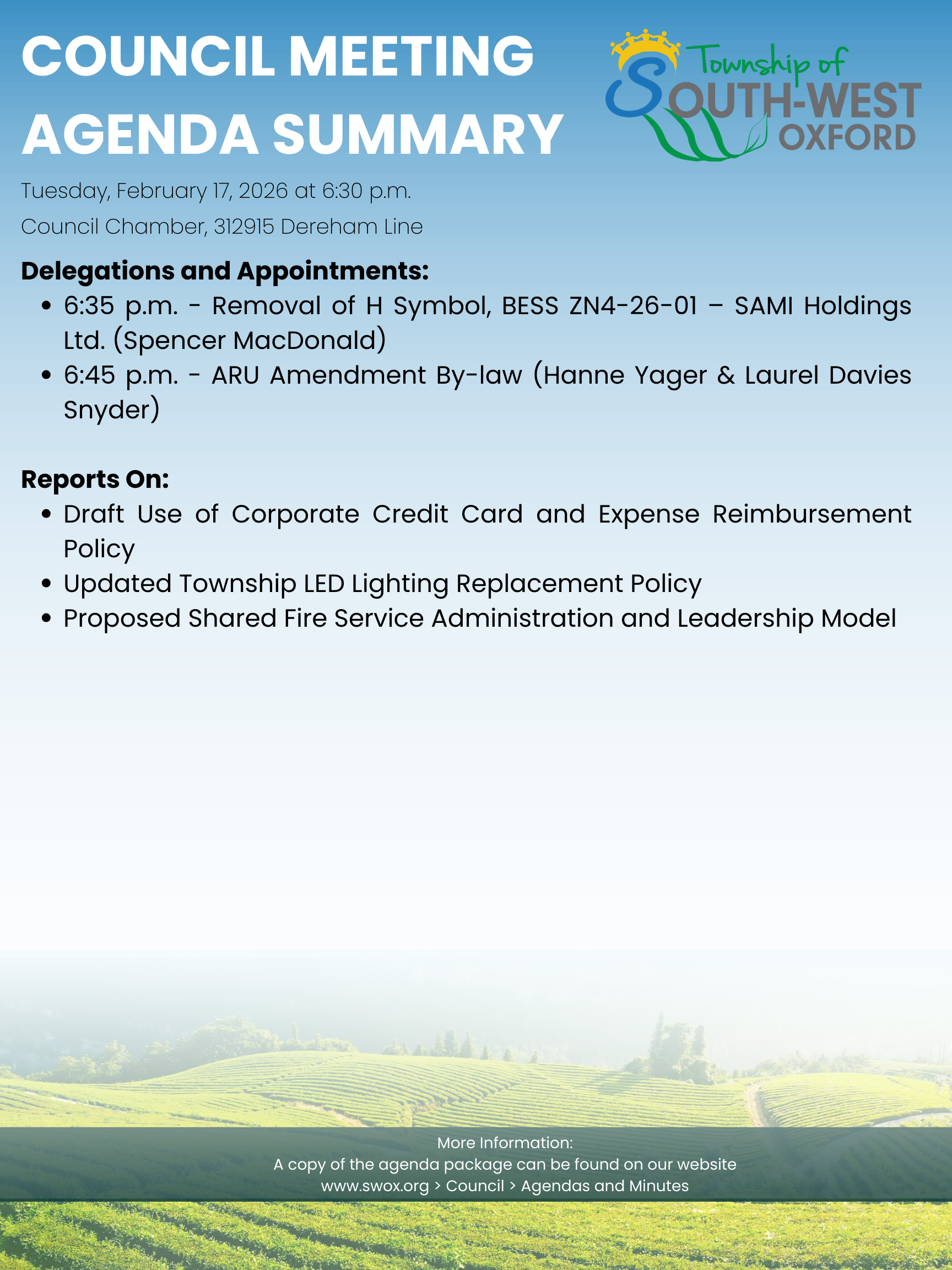 Correspondence to Council can be sent to the Township Office, 312915 Dereham Line, Mount Elgin ON, NOJ 1N0 to the attention of the Clerk or e-mailed to: dgiles@swox.org